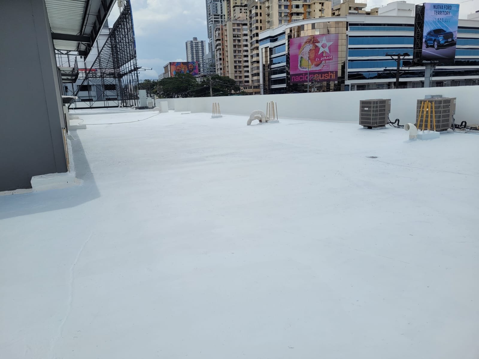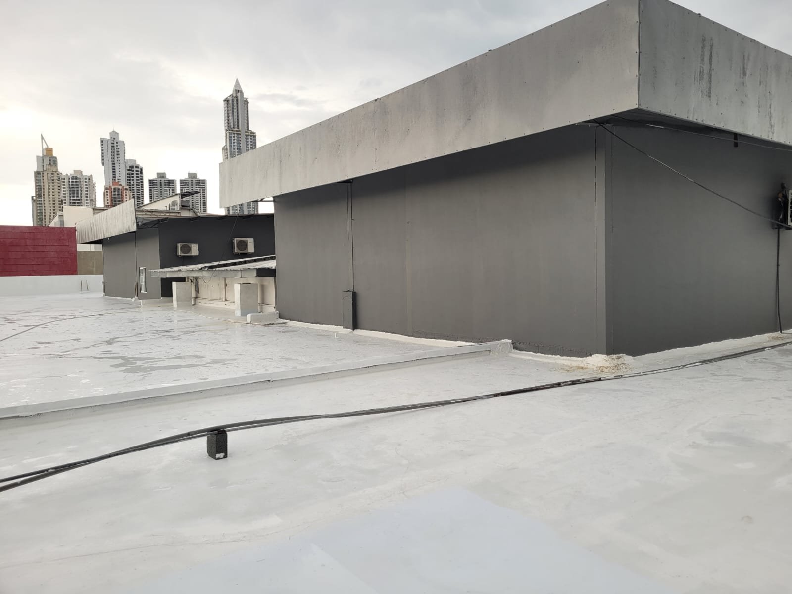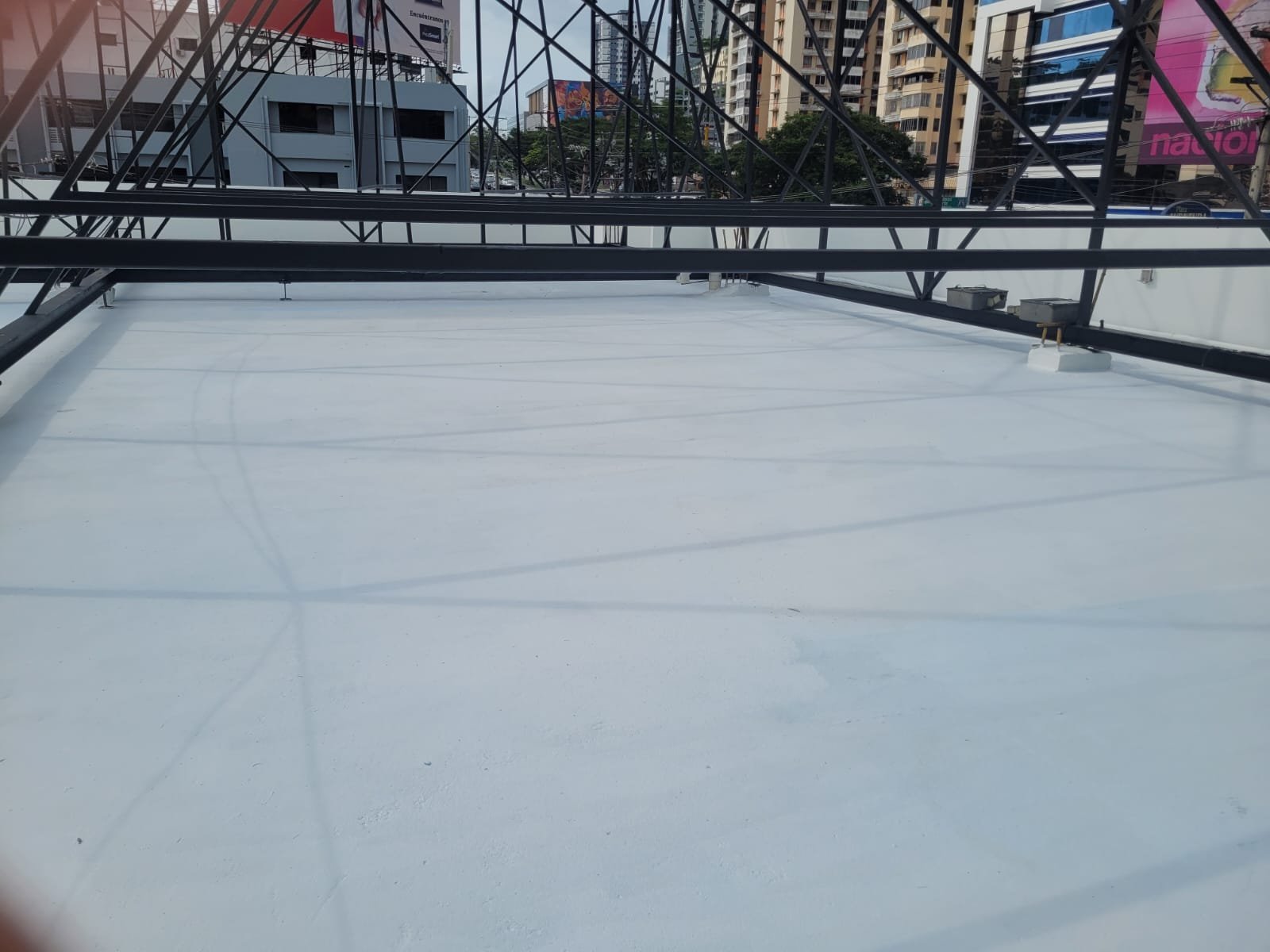 Impermeabilización de losa: Se realizó un topping para crear los declives adecuados hacia los desagües y se impermeabilizó con URETHANIZER RC-994 de Lanco.